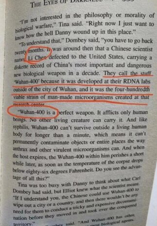 به گزارش همشهری آنلاین به نقل از South China Morning Post، دین کونتز Dean Koontz در کتاب چشمان تاریکی The Eyes of Darkness از ویروسی نوشته است که ویژگی‌هایی مشابه ویروس کرونا یا کووید 19 دارد. او در این کتاب، از ویروسی نوشته است که در شهر ووهان چین، در آزمایشگاه ساخته شده است. آنچه توجه مردم را در هفته گذشته جلب کرده، تاریخ انتشار کتاب است.این کتاب در سال ۱۹۸۱ منتشر شده است.در این کتاب از ویروسی به نام ووهان-400 به عنوان سلاحی آزمایشگاهی نام برده شده؛ ویروسی که در آزمایشگاهی در شهر ووهان چین ساخته شده است.